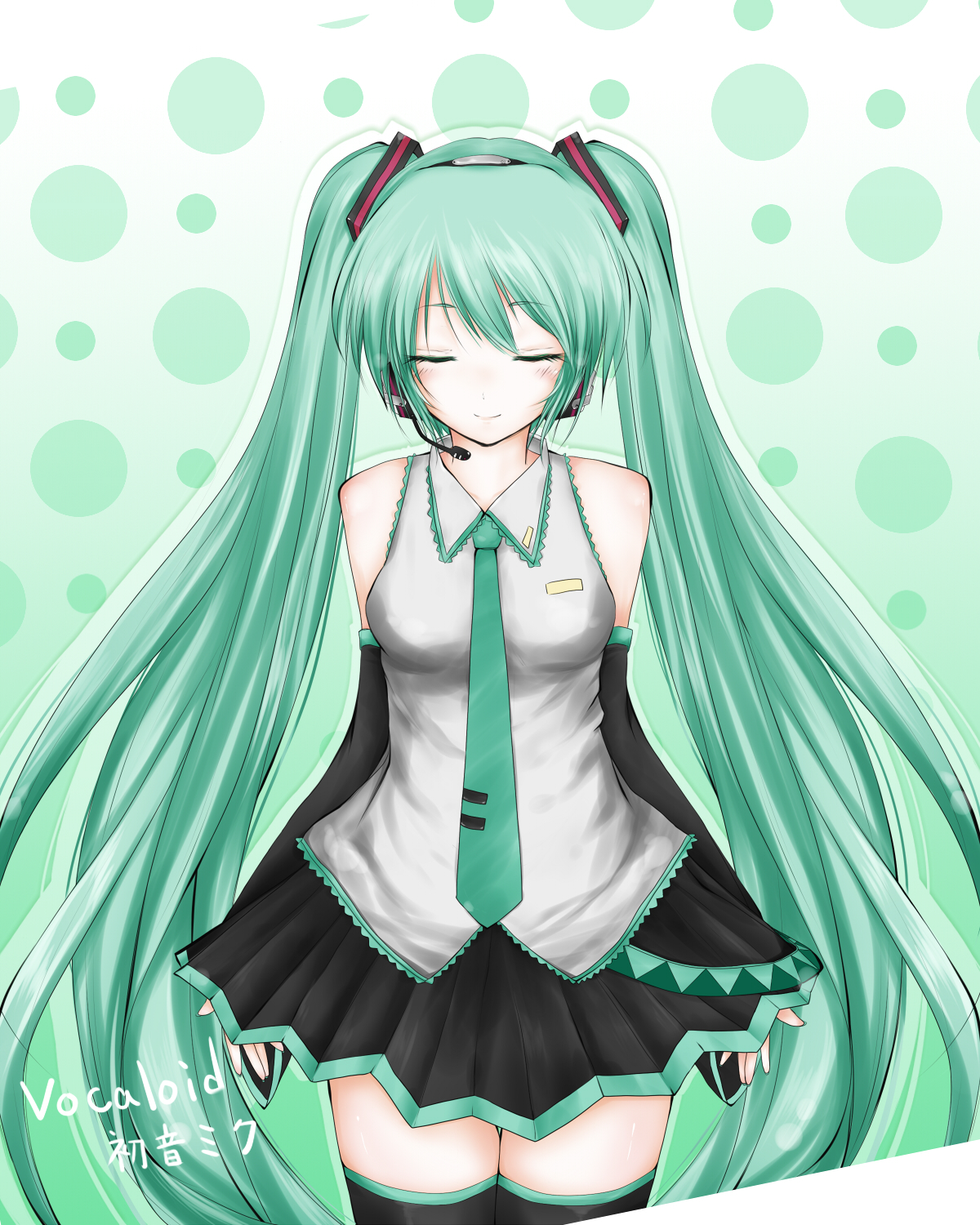 closed eyesdetached sleevesgreen hairheadsetlong hairnecktieskirtsolothighhighstwintailsvery long hairzettai ryouiki