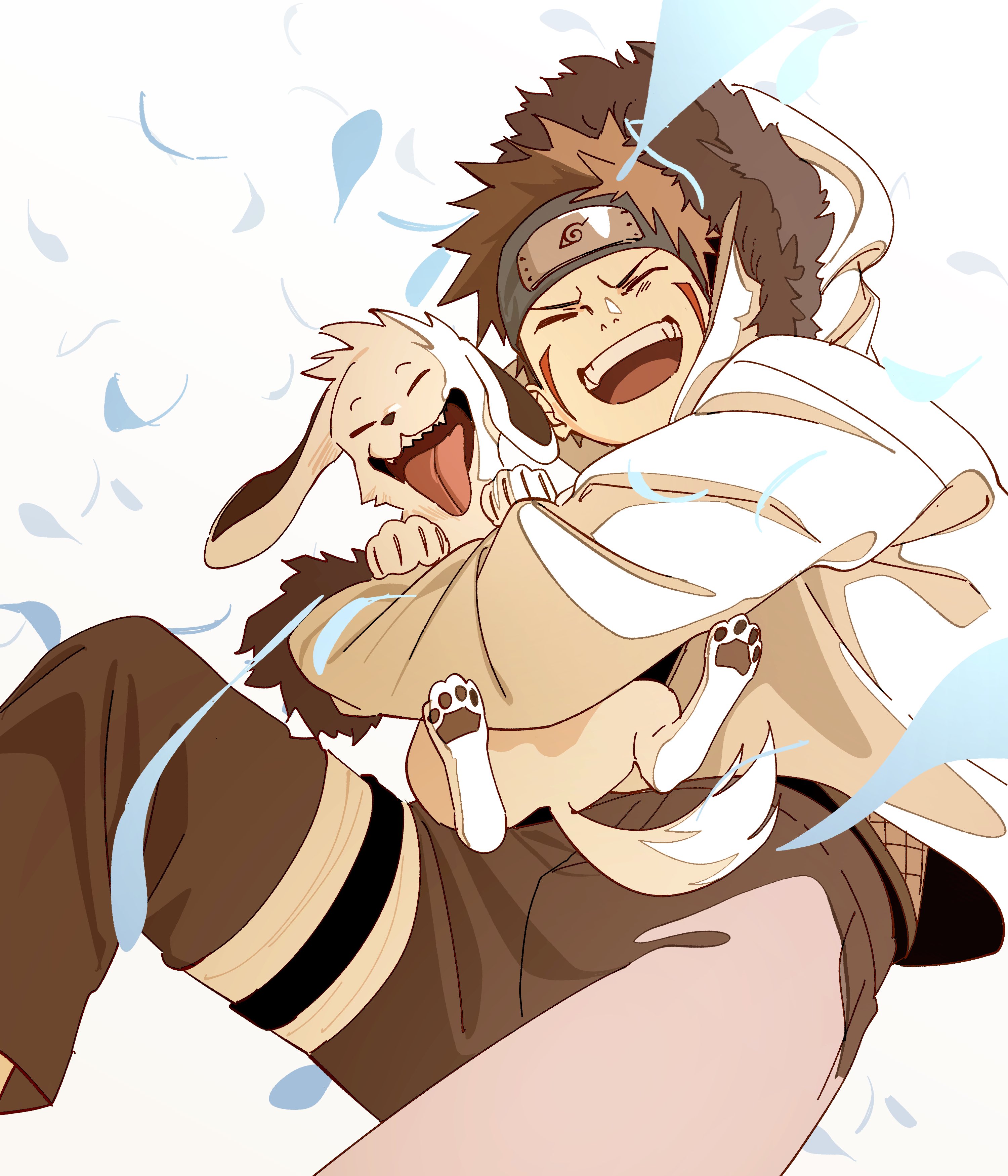 1boyanimalbandaged legbandagesblue headbandbrown hairclosed eyescoatdogfacial markfalling leavesfeet out of framefur trimfur-trimmed coatfurrowed browgrey pantsheadbandholdingholding animalholding doghoodhood upkonohagakure symbollaughingleafmale focusopen mouthpantsshort hairspiked hairtonguetongue outwhite backgroundwhite coat