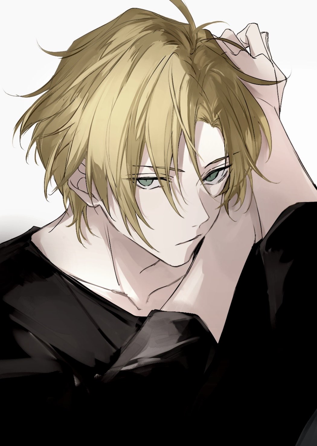 1boyarms upblack shirtblonde hairblue eyesclosed mouthcollarbonelong sleeveslooking at viewermale focusparted hairshirtsimple backgroundsolowhite background