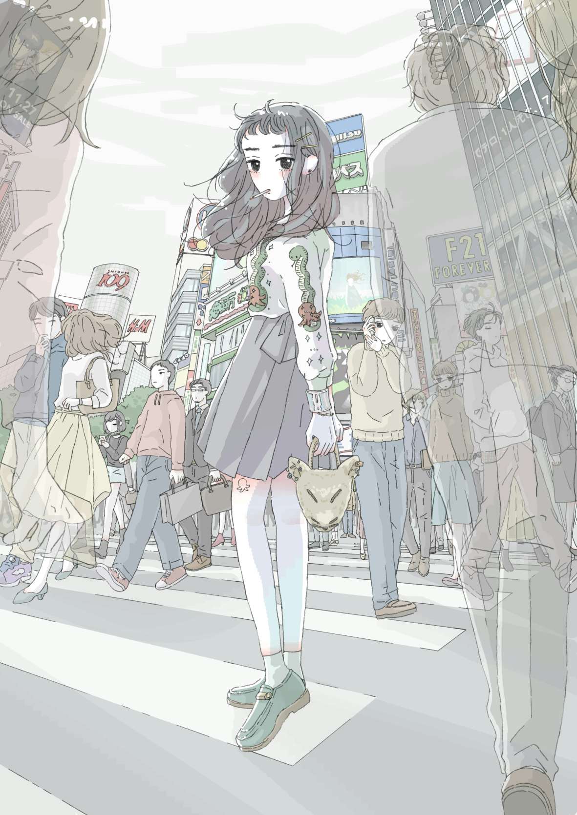 6+boys6+girlsbagblack hairblue shoesbriefcasebrown hairbuildingcityscapecrosswalkearringshair ornamenthaircliphandbagholdingholding briefcasehoodhood downhoodiejewelryloaferslong hairlooking at viewermedium hairmultiple boysmultiple girlsoctopus tattoooutdoorspeoplepleated skirtshoesshort hairskirtskysockssolosolo focusstandingsweatertattoowalkingwhite sockswhite sweater