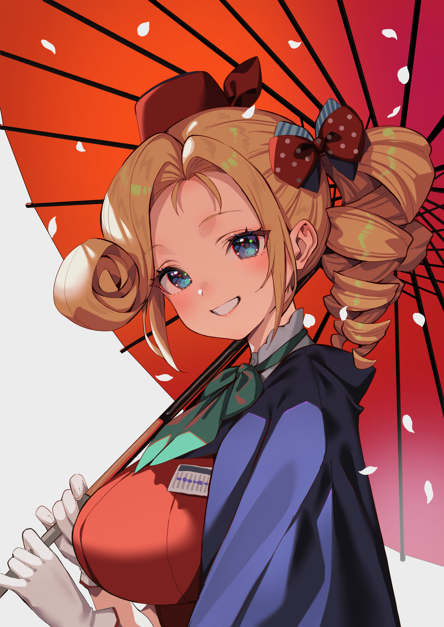 1girlblonde hairblue bowblue eyesblue jacketbowbreastsdrill hairglovesgreen ribbonjacketlarge breastslooking at viewername tagred bowred shirtribbonshirtsmileumbrellavictoria romanvirtual youtuberwhite gloves