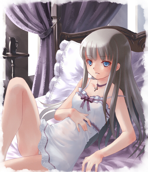 1girlbedblue eyescanopy bedchemisechokercrossfemale focusflat chestfrilled pillowfrillsgrey hairlong hairpantiespillowrecliningsee-through clothessolostrap slipsunlightunderwearwindow