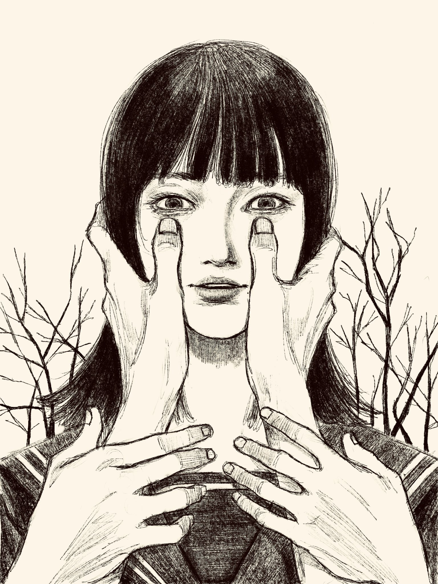 1girl1otherblack hairhand on another's armhand on another's facehand on another's headlong hairlooking at viewersailor collarsolosolo focusstraight-onwhite background