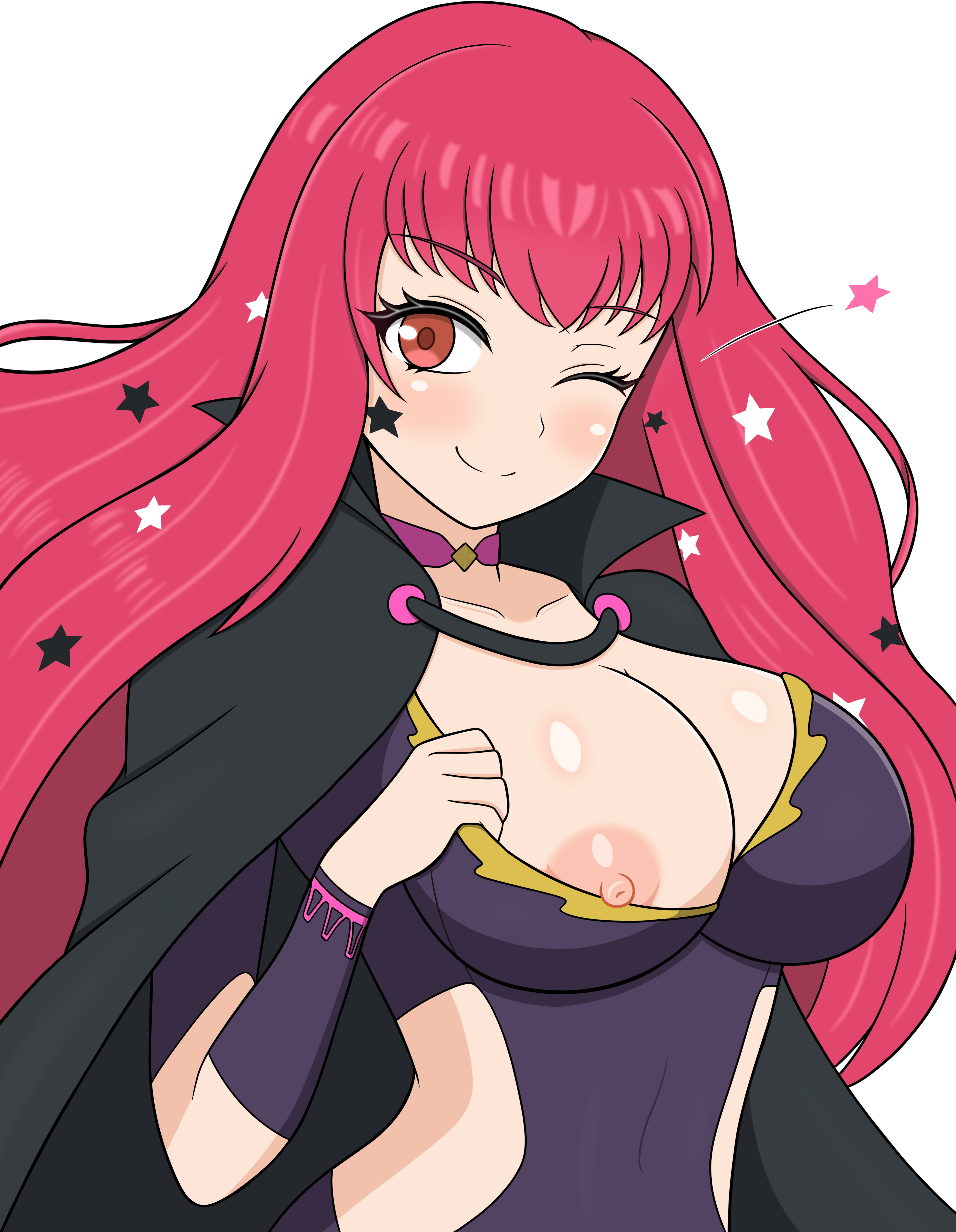 1girlblack capebodysuitbreastscapechokercleavageclothing cutoutfacial markhair ornamentlarge breastslong hairlooking at viewernipplespink chokerpresenting breastspurple bodysuitred eyesred hairside cutoutsmilesolostar (symbol)star facial markstar hair ornament