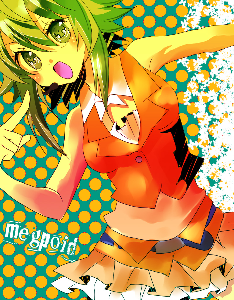 1girlfemale focusgreen eyesgreen hairmatching hair/eyesopen mouthorange themeshort hairskirtsolo