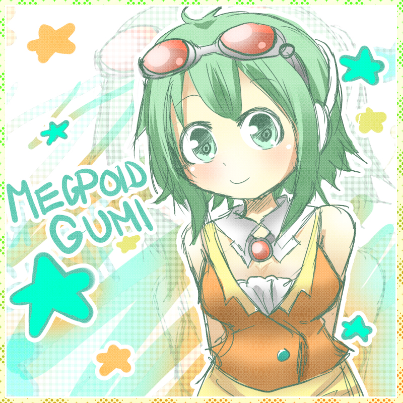 1girlarms behind backfemale focusgogglesgreen eyesgreen hairheadphonesmatching hair/eyesshort hairsmilesolostar (symbol)