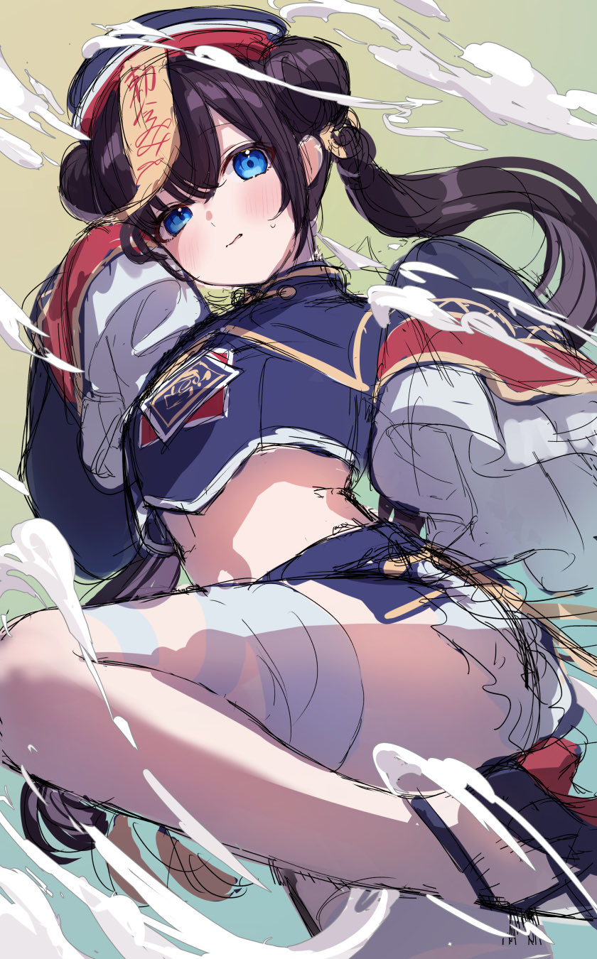 1girlblack hairblue eyesdouble bunfloating hairfrilled sleevesfrillshair bunhathigh heelsjiangshi costumelong hairmidriffofudaofuda on headsketchskirtsleeves past fingerssleeves past wristssmall sweatdropsolotwintailswavy mouth