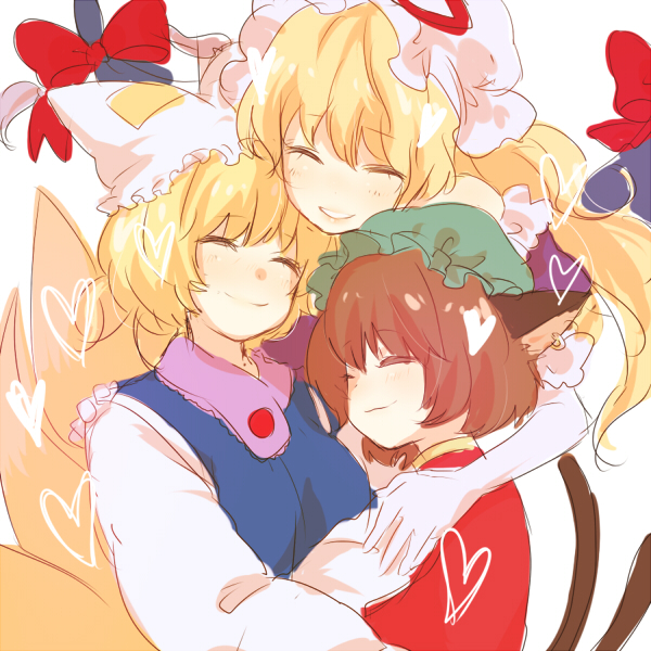 3girlsanimal earsanimal hatblonde hairbrown haircat earscat girlcat tailclosed eyesearringselbow glovesfamily bondingfemale focusfox tailgloveshappyhathearthugjewelrylong sleevesmob capmultiple girlsmultiple tailsribbonshort hairshort sleevessingle earringsmiletailtassel