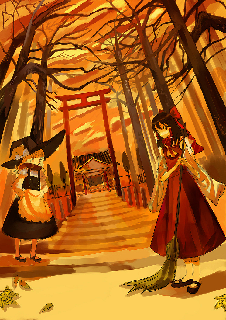 2girlsautumnbroomfemale focusforesthatmultiple girlsnatureoutdoorsplantscarfshrineskytoriitreewitchwitch hat