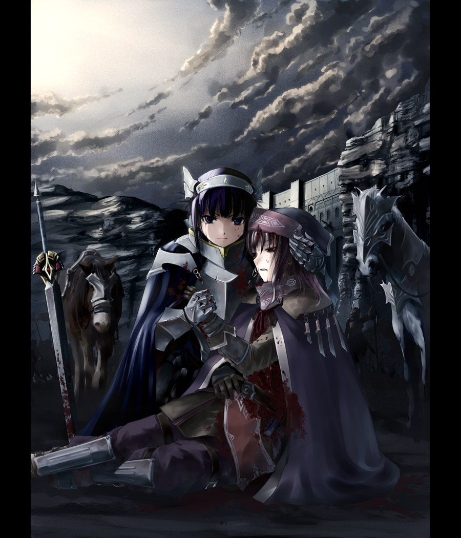 2girlsarmorbardingblack hairbloodblood from mouthblood on clothesblue eyesbrown hairclouddyingfantasygauntletshathorsemultiple girlsoutdoorspillarboxedplantedplanted swordplanted weaponswordtearsvalkyrieweapon
