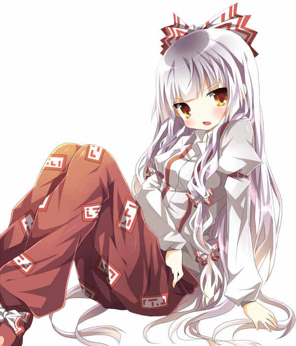1girlfemale focushair ribbonlong hairpantsred eyesribbonsimple backgroundsittingsolosuspenderswhite background