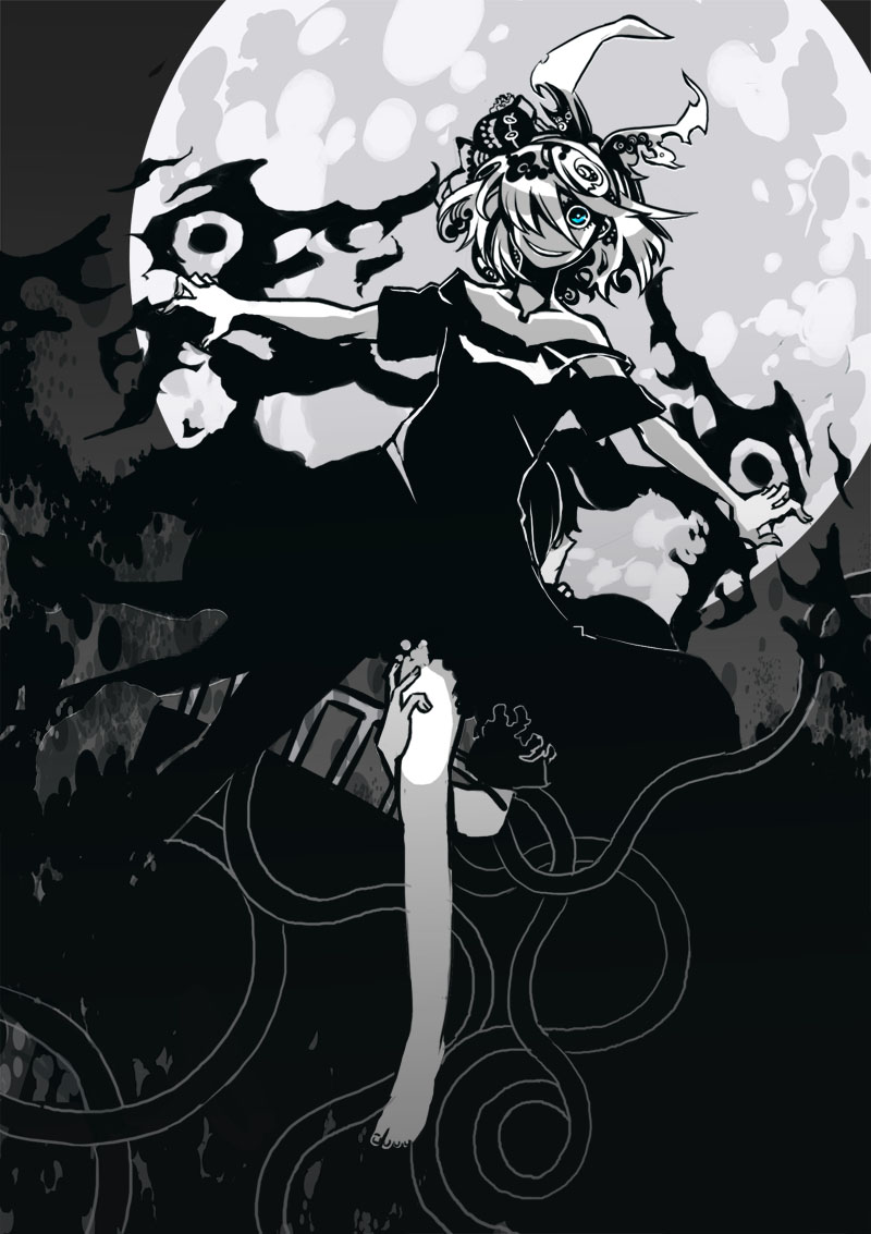 1girlblue eyesdressfemale focusfull moonhair ribbonmonochromemoonoutdoorsribbonshort hairskysmilesnakesolospot colortorn clothes