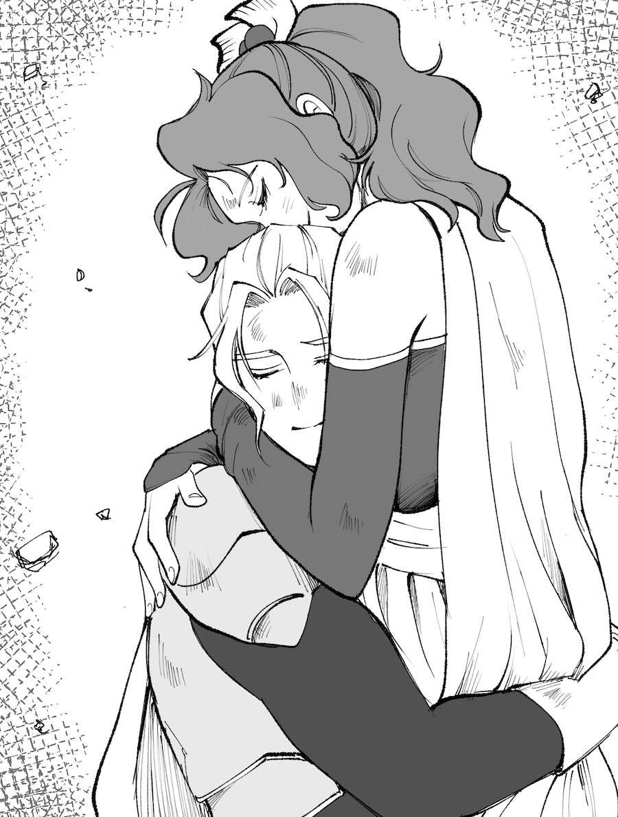 1boy1girlarmorarms around neckarms around waistbare shoulderscapeclosed eyesdetached sleevesdirtydirty clothesdirty facegreyscalehair ribbonhugika okura 66light smilelong hairmonochromeparted bangsponytailribbonsashshoulder armorupper bodywaist sashwavy hair
