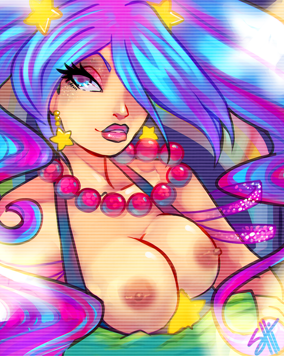 alternate costumeblue eyesblue hairbreastsbreasts outsideearringseyeshadowfemaleFlag for Deletionhair ornamenthair over one eyelipsticklong hairmakeupnecklacenipplesparted lipspearl necklacepurple hairsmilesolostar hair ornamenttied hairtwintailstwo-tone hair
