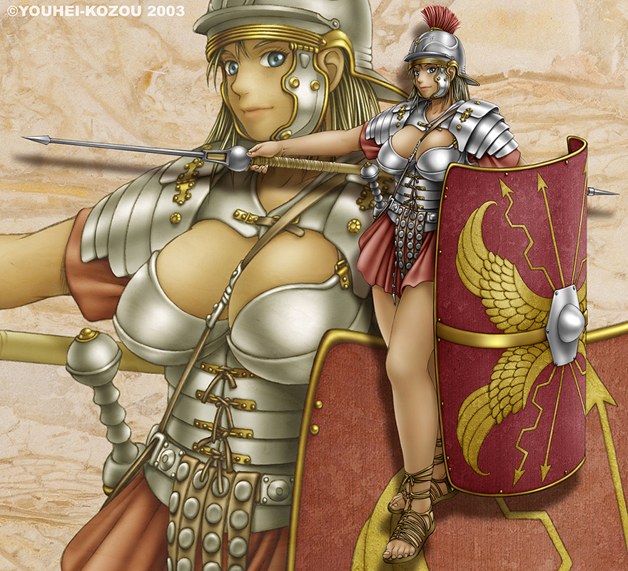 00s1girl2003ancient romearmorartist nameblonde hairblue eyesbreastscleavage cutoutclothing cutoutfemale focushuge breastsjavelin (spear)large breastslegionarylong hairlooking at viewerlorica segmentataminiskirtpilumpolearmsandalsscutumshieldskirtsolospearweaponzoom layer