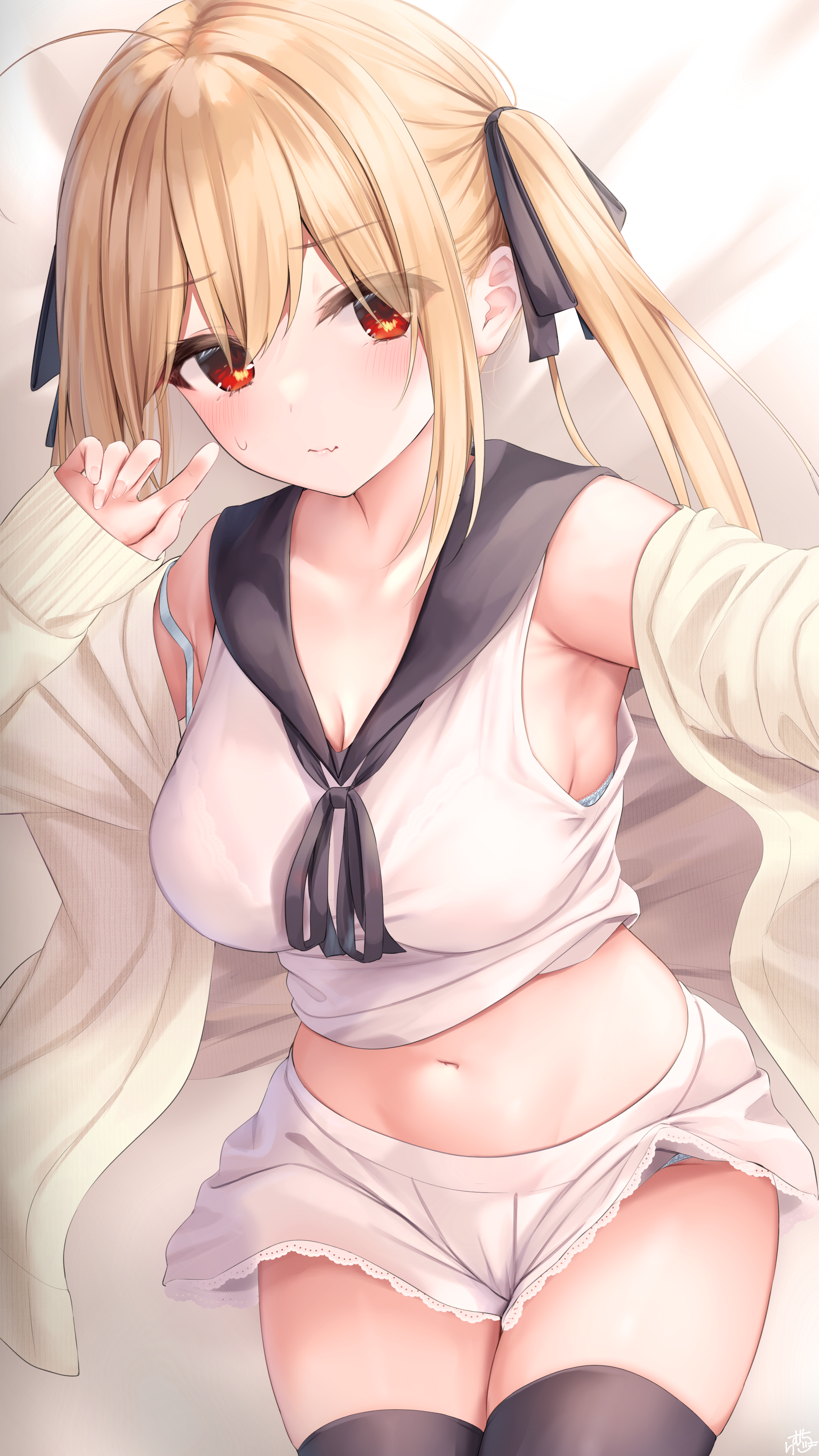 1girlahogearmpitsblack ribbonblack sailor collarblack thighhighsblonde hairblue brablue pantiesblushbrabra peekbreastscardigancellphonecleavageclosed moutheyes visible through hairfanghair between eyeshair ribbonhand uplarge breastslegs togetherlong hairlong sleeveslooking at viewermidriffnaveloff shoulderopen cardiganopen clothesoutstretched armpantiespanty peekphonered eyesribbonsailor collarselfieshirtshort shortsshortssleevelesssleeveless shirtsleeves past wristsstrap slipthighhighstwintailsunderwearwhite shirtwhite shortsyellow cardigan