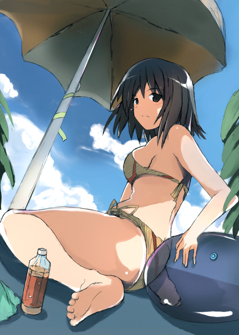 1girlbare shouldersbarefootbeachbikiniblack eyesblack hairbreastsclouddayfeetfemale focusmedium breastsoutdoorsshort hairside-tie bikini bottomsideboobskysoloswimsuitumbrella
