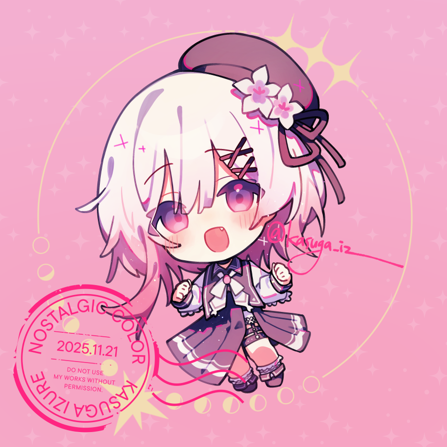 :d1girlberetblack dressblack hatchibichibi onlydateddressfangflowerfull bodygradient hairhair flowerhair ornamenthatlong sleeveslooking at viewermulticolored hairopen mouthpink backgroundpink eyespink hairshort hairsmilesolowhite flowerwhite hairx hair ornament