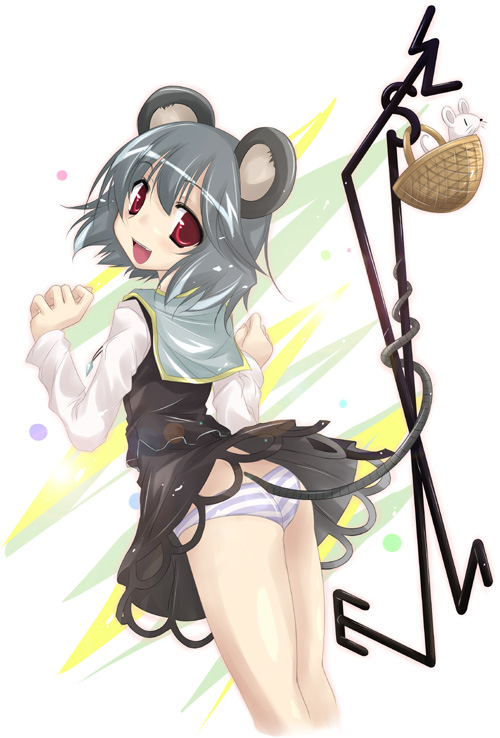 1girlanimal earsbasketcapeletdowsing rodfemale focusgrey hairjewelrylooking backmouse (animal)mouse earsmouse tailnecklaceopen mouthpantiesred eyesshort hairsmilesolostriped clothesstriped pantiestailunderwear