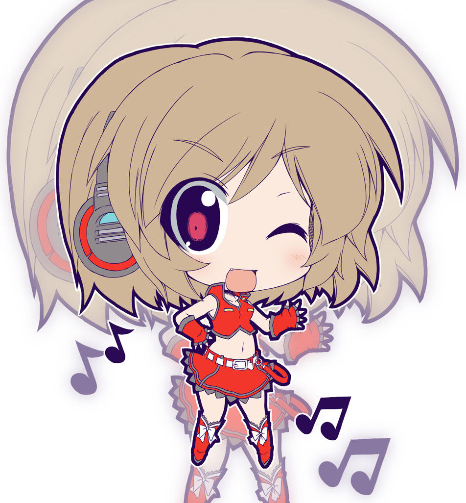1girlbeltbig headbootsbrown eyesbrown hairchibifangfemale focusfingerless glovesglovesheadphonesheadsetmidriffmusical notenavelone eye closedred eyesshort hairskirtsmilesolowhite backgroundwink