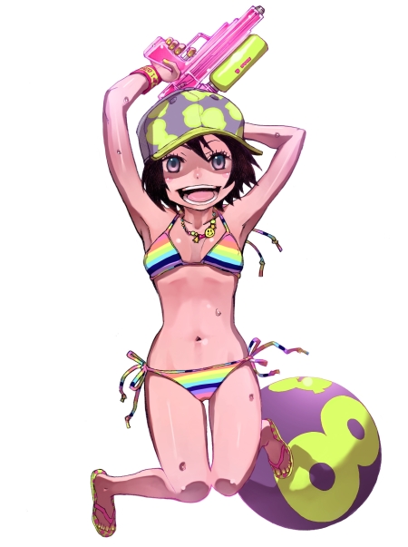 1girlballoonbaseball capbikinifemale focushatjewelrynecklacesimple backgroundsmilesolostriped bikinistriped clothesswimsuitwater gun