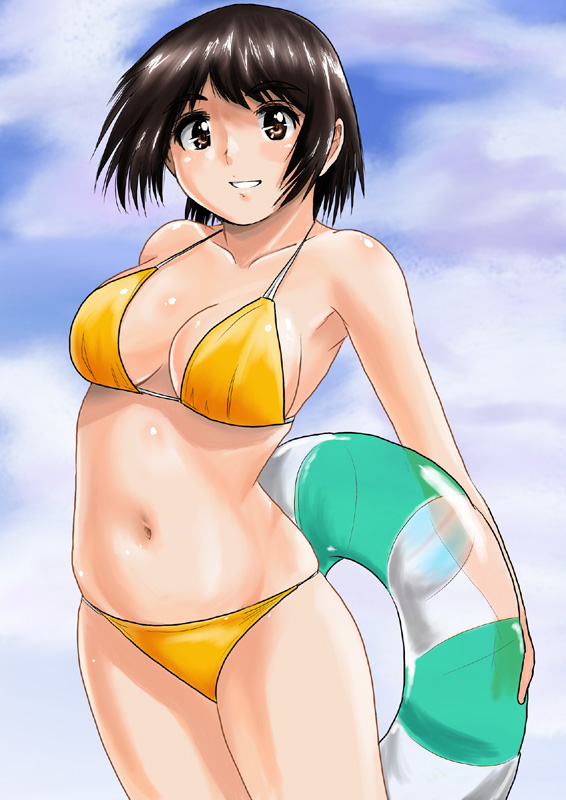 1girlbikinibob cutbrown eyesbrown hairdayfemale focusinnertubeshiny skinshort hairsoloswim ringswimsuitthick eyebrowsyellow bikini