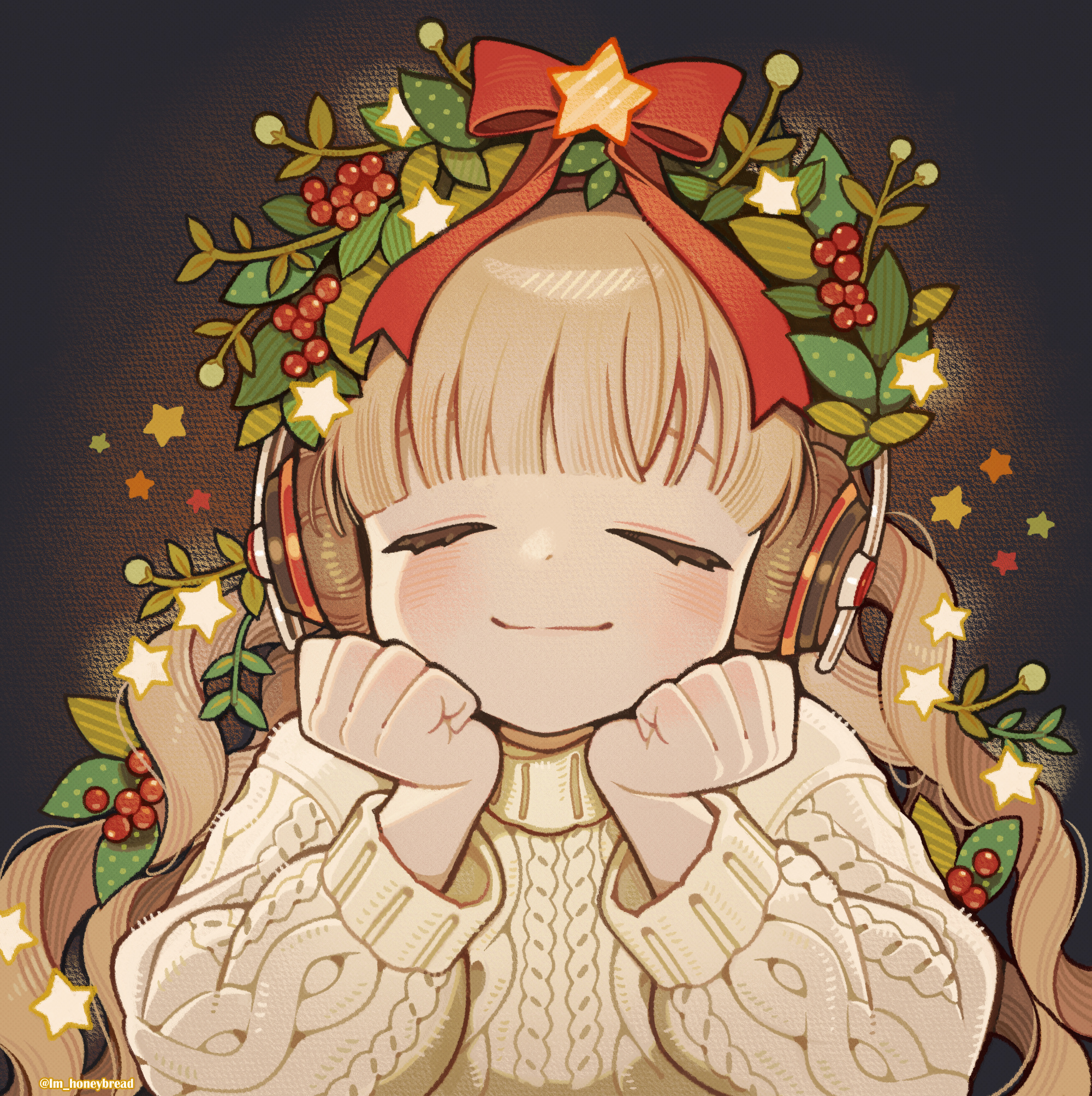 1girlblonde hairblunt bangsblushbowchristmasclosed eyesclosed mouthhead restheadphonesleaflong hairlong sleevesred bowsmilesolostar (symbol)sweaterupper bodywhite sweater