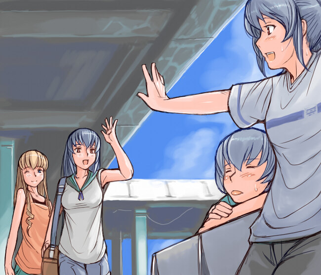00s1boy3girlsaged upblonde hairblue eyescasuallong hairmultiple girlsone eye closedshirtshort hairsiblingssleevelesssleeveless shirtsweatt-shirtwink