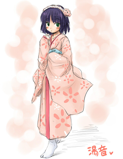 1girlblushfemale focusflowerfull bodygreen eyeshairbandjapanese clotheskimonopurple hairshort hairsketchsolotabi
