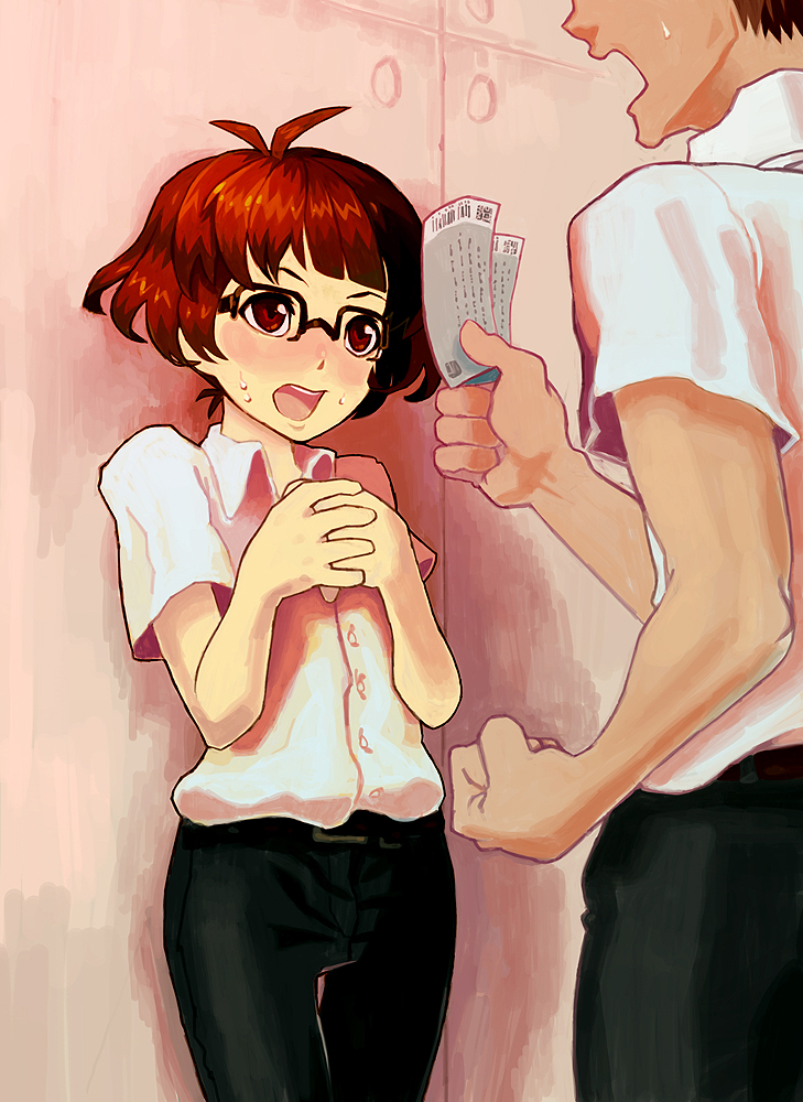 00s2boysandrogynousantennaebeltblouseblushbrown eyesbrown hairglassesmale focusmultiple boyspantsschool uniformshirtsweatthigh gapthighstickettrap