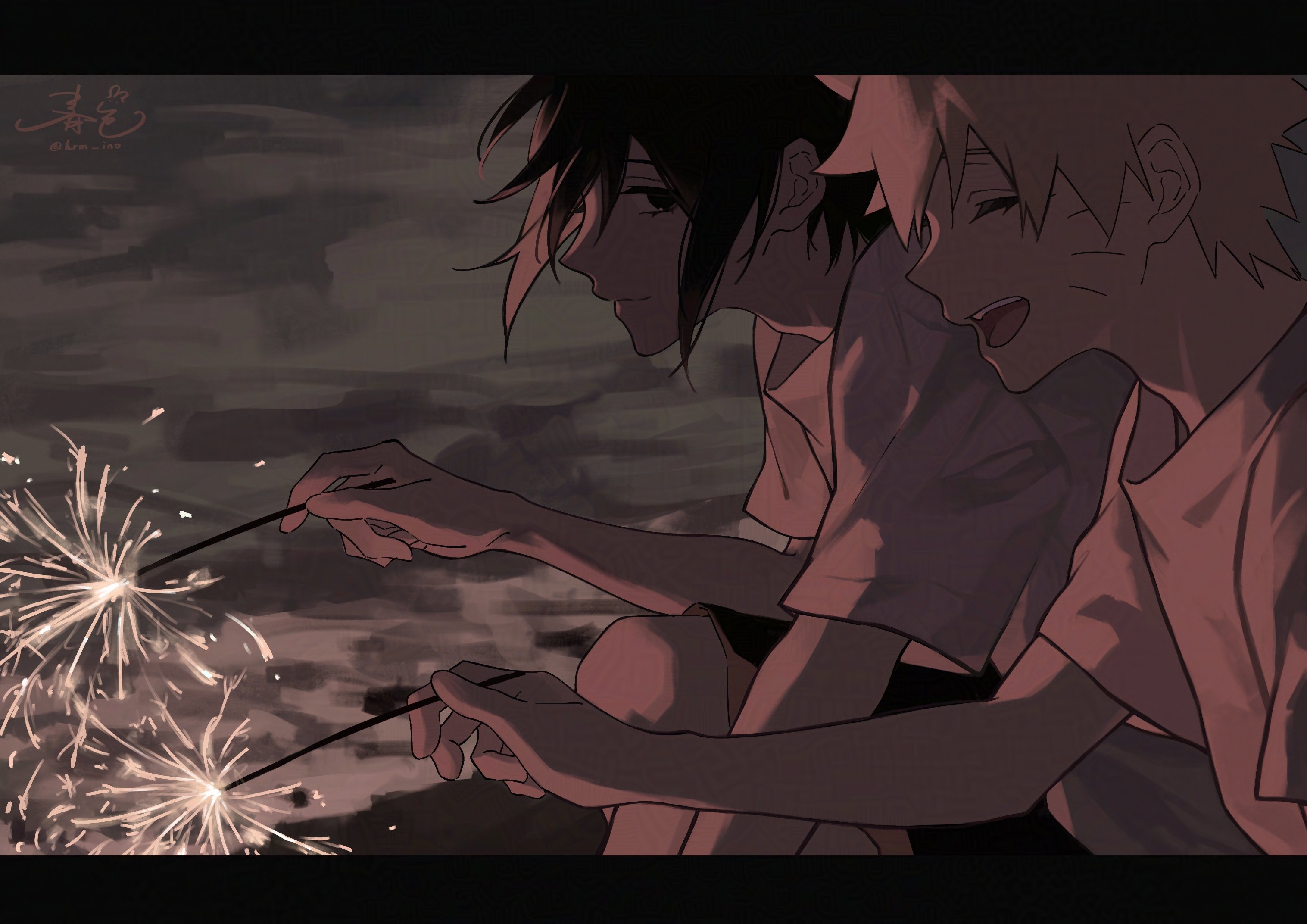 2boysblack borderblack hairblack shortsblonde hairborderclosed eyesfacial markfireworkshair between eyesholdingholding fireworkslooking at anothermale focusmultiple boysopen mouthshirtshort hairshortssignaturesmilesparklerspiked hairtwitter usernameupper bodywhisker markingswhite shirt