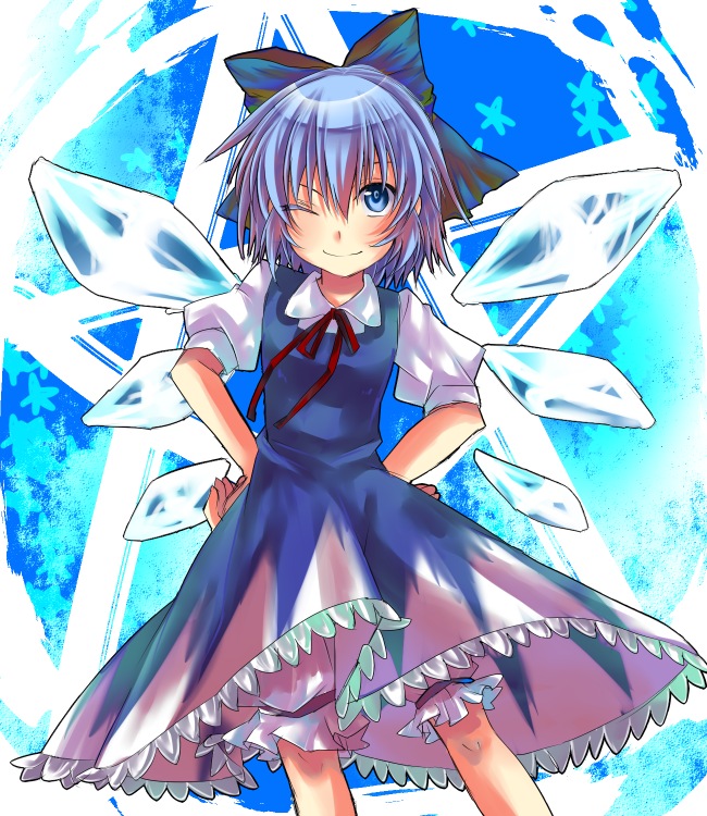 1girlbloomersblue eyesblue hairbowdressfemale focushair bowhands on own hipsmatching hair/eyesshort hairsmilesolounderwearwingswink