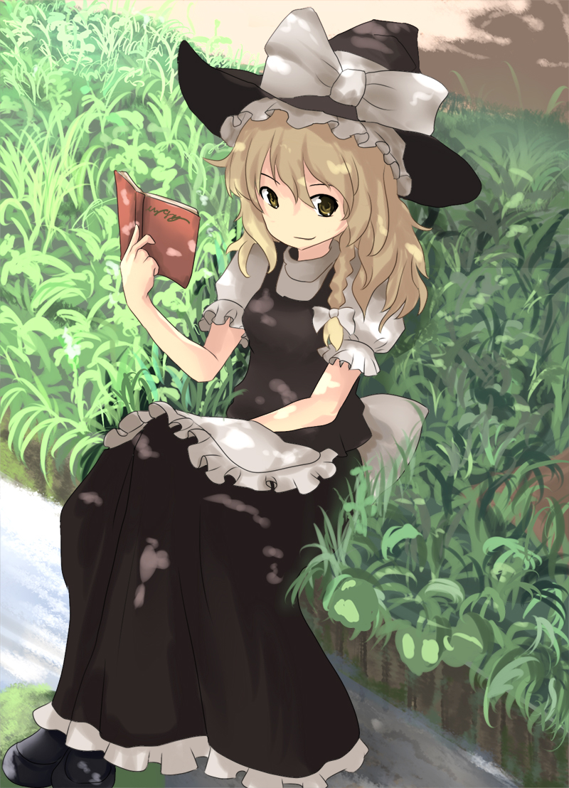 1girlapronblonde hairbookbraidfemale focushatlong hairnatureopen bookreadingside braidsittingsmilesolowaist apronwitch hatyellow eyes