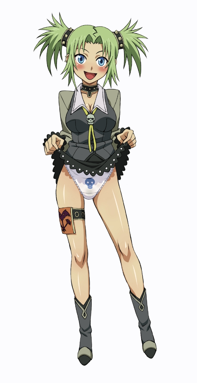 00s1girlblue eyesblushbootsbreastscleavageclothes liftfemale focusgreen hairknee bootslarge breastslegslong legspantiespantyshotsimple backgroundskirtskirt liftskullsmilesolothighstwintailsunderwearupskirt