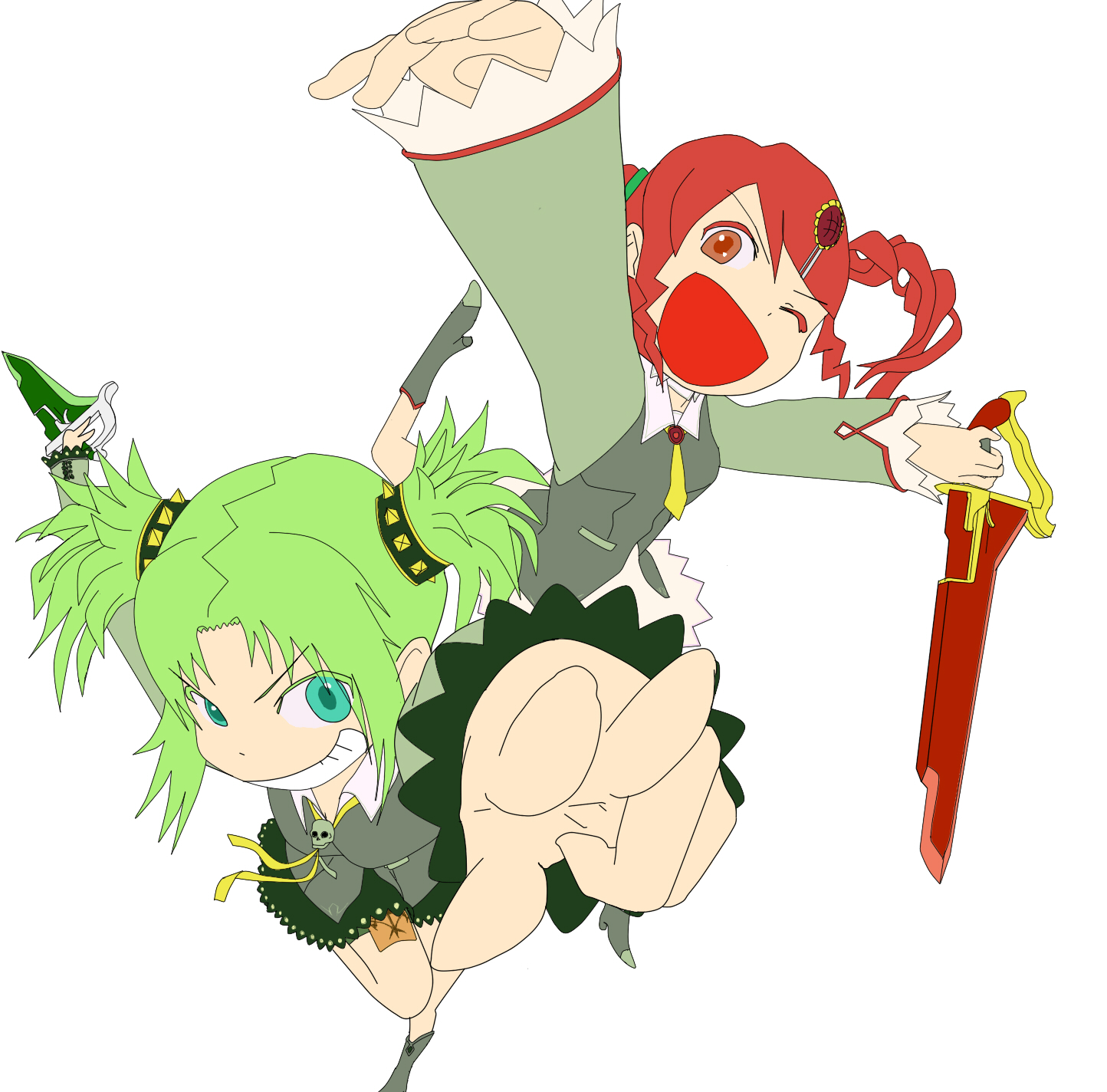 00s2girlsbootsgreen eyesgreen hairgrinhigh heelsmultiple girlsone eye closedpointingred eyesred hairshoesshort hairshort twintailssimple backgroundskirtskullsmileswordtwintailsweaponwink