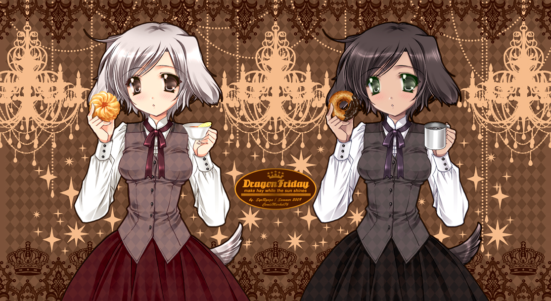 2girlsanimal earsblack hairblushbowbrown eyeschocolate-covered foodcupdog earsdonutfoodgreen eyesgrey hairmugmultiple girlsold-fashioned donuttail