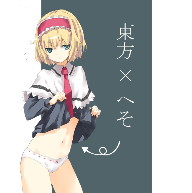 1girlaqua eyesblonde hairbottomlessclothes liftfemale focusgreen eyeshairbandnavelnecktieno pantspantiesshirt liftshort hairsolosquare-end necktieunderwear