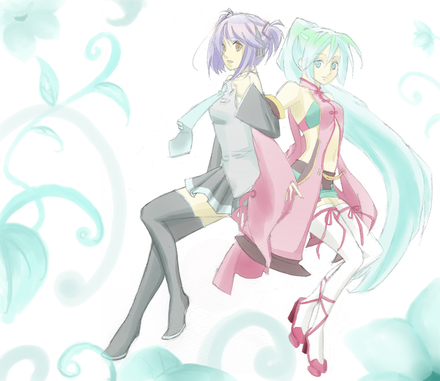 2girlsblue hairbrown eyescosplaycostume switchdetached sleevesfootwear ribbongreen eyesgreen hairhatsune miku (cosplay)long hairluca truelywaath (cosplay)midriffmultiple girlsnecktieponytailshort hairthighhighstwintailsvery long hairzettai ryouiki