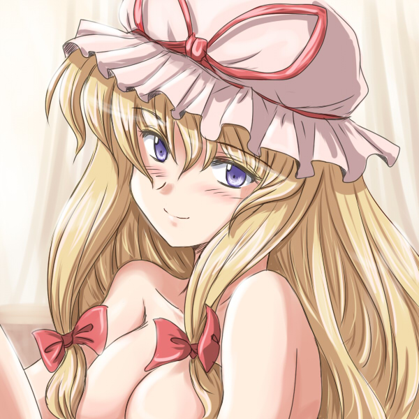 1girlblonde hairblushbowbreastscleavagefemale focushair bowhatlarge breastslong hairnudepurple eyespurple hairsmilesoloupper body