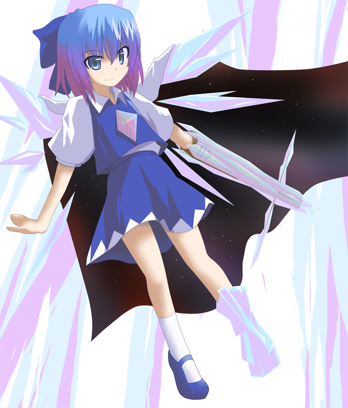 1girlasymmetrical clothesasymmetrical footwearblue eyesblue hairbowcapecosplayfemale focushair bowicematching hair/eyesmismatched footwearreiuji utsuho (cosplay)sockssolowings