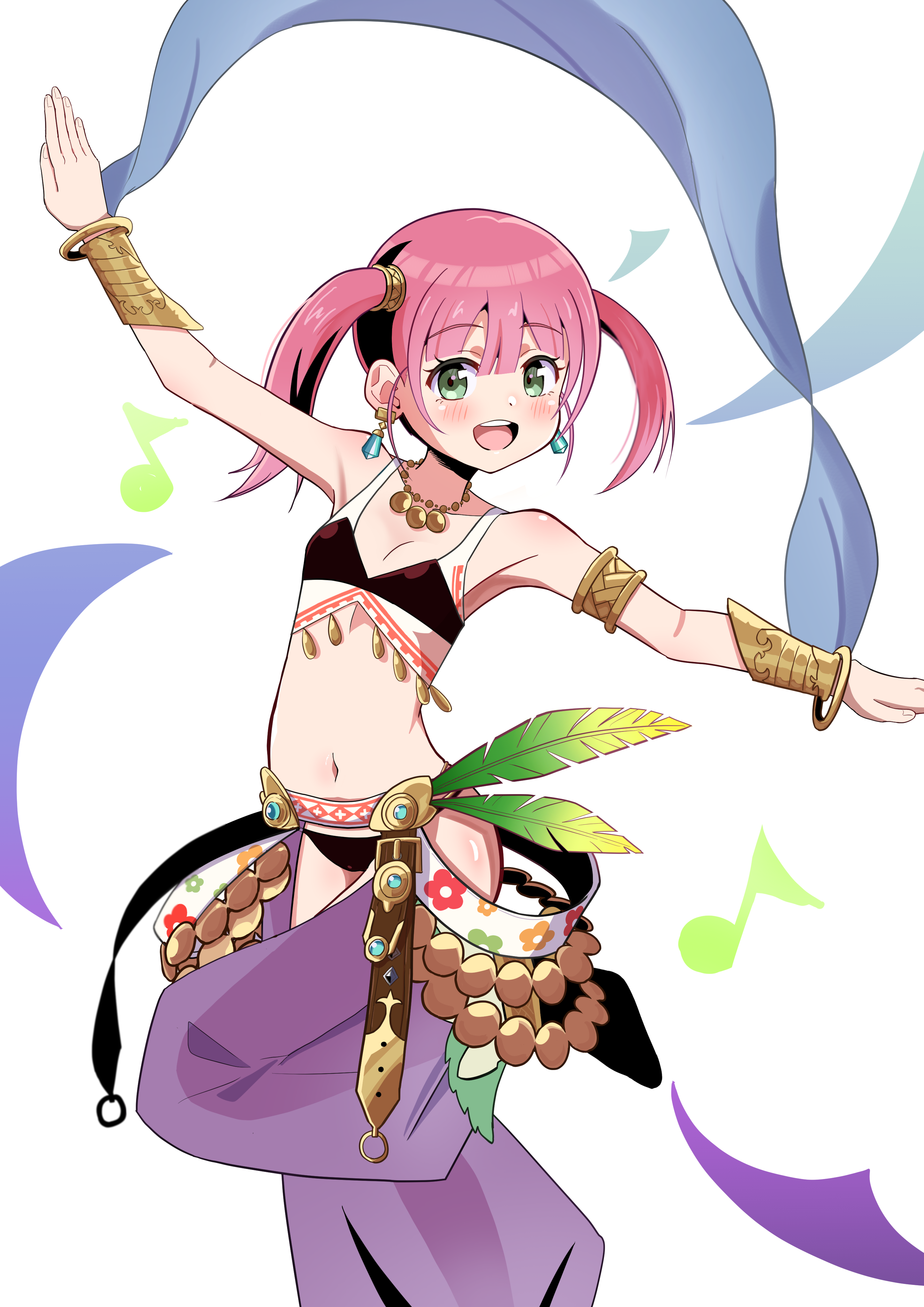 1girlbeltbikiniblushbraceletdancerearringsfeathersflat chestgreen eyesgreen feathersjewelrymusical notenavelnecklaceopen mouthpink hairred bikiniscabbardsheathsmilesolostandingstanding on one legswimsuittwintailswhite background