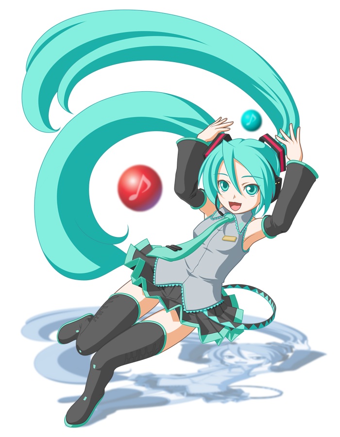 1girlaqua eyesaqua hairdetached sleevesfemale focusheadphonesheadsetlong hairmusical notenecktiesmilesolothighhighstwintailswhite backgroundzettai ryouiki