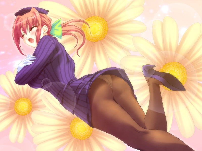 1girlassblushclosed eyescrossed armsdaisy (flower)female focusflowergloveshathigh heelslens flareopen mouthpantiespanties under pantyhosepantyhosepantyshotpink hairponytailshoessolounderwearupskirtwhite gloves