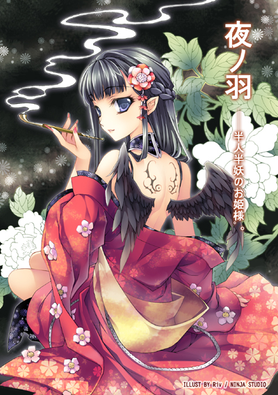1girlbackbare backbare shouldersblack hairblue eyesbraiddetached collarfemale focusflowerfrom behindjapanese clotheskimonokiseruleaflong hairoff shouldersmokesmokingsmoking pipesolowings
