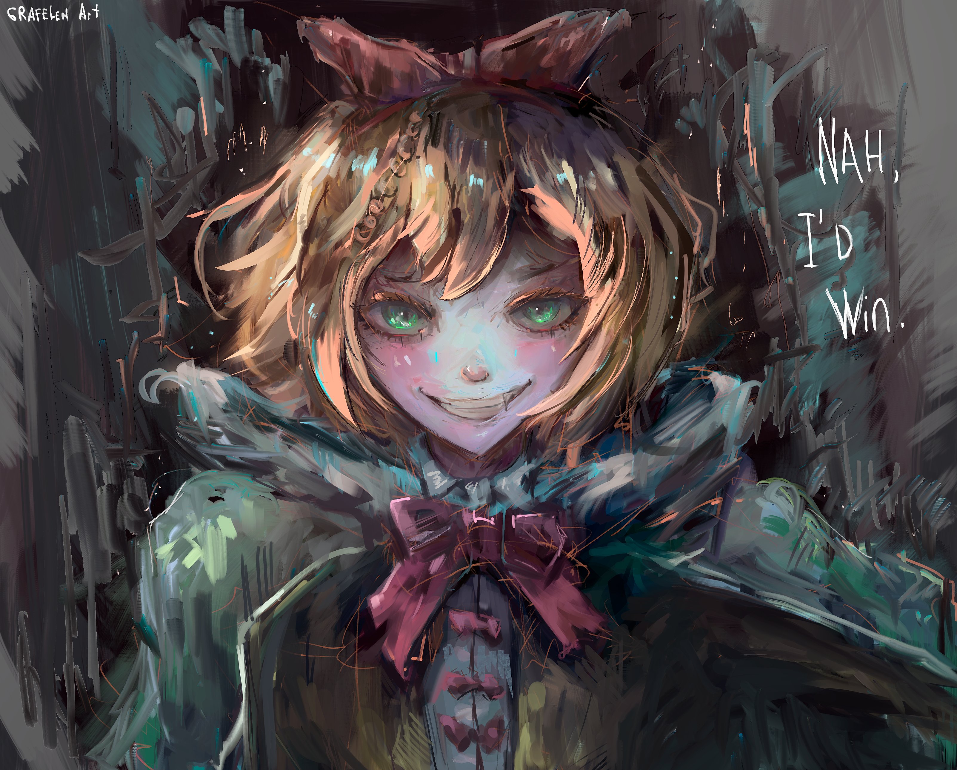 1girlbowcapeevil smilegrafelemartgreen capegreen eyeshair bowmemenah i'd win (meme)orange hairred bowsimple backgroundsmileteeth