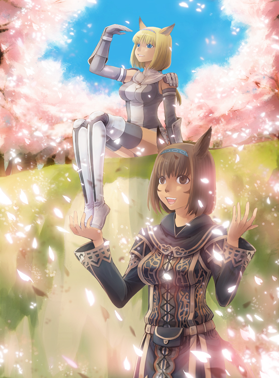 00s2girlsanimal earsblonde hairblue eyesbrown eyesbrown haircat earscat tailcherry blossomsmultiple girlsshort hairtail