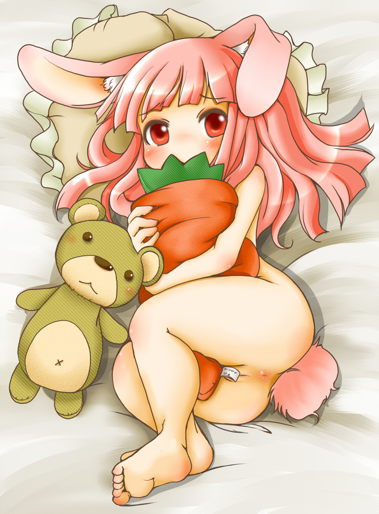 1girlanimal earsanusassbarefootbedblushcarrotfeetfemale focuslolilong hairlyingnudepink hairpussyrabbit earsred hairsolostuffed animalstuffed carrotstuffed toytailteddy beartoes