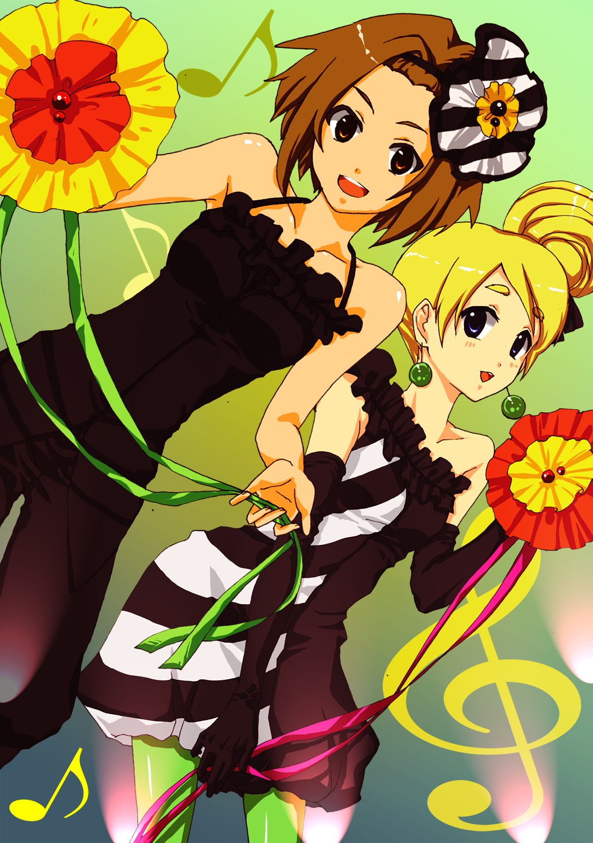 00s2girlsblonde hairblue eyesbrown eyesbrown hairdresselbow glovesfrillsglovesmultiple girlsmusical notepantyhoseshort hair