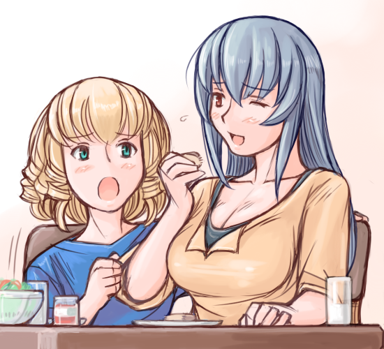 00s2girlsaged upblonde hairbreastscasualeatinggreen eyeslarge breastsmultiple girlsone eye closedwink