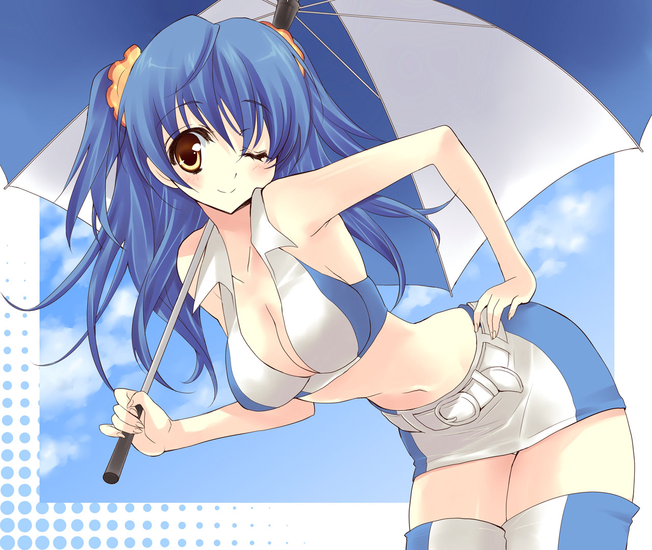 1girlbeltbent overblue hairblushbreastsbrown eyescleavagefemale focushair ribbonhand on own hiphip focuslarge breastsleaning forwardlong hairmidriffminiskirtnavelone eye closedpencil skirtrace queenribbonskirtsmilesolothighhighsumbrellawinkyellow eyeszettai ryouiki